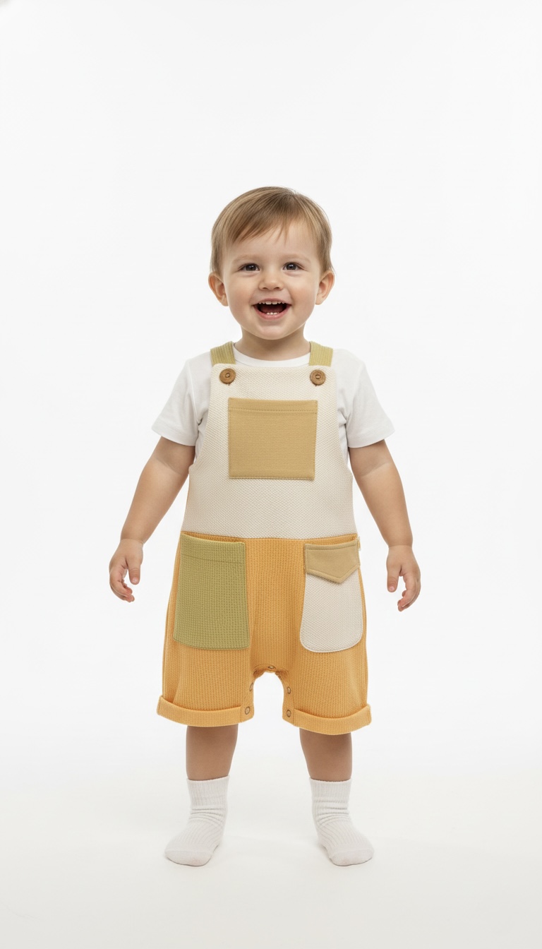 Confeccionada em tecido macio e confortável, permite liberdade de movimentos e bem-estar durante as brincadeiras. O design com recortes e bolsos aplicados traz charme e identidade à peça, tornando o visual leve e atemporal.