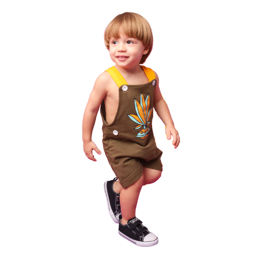 Jardineira curta para bebês e crianças de até 6 anos, desenvolvida em moletom com toque macio e super confortável, sem etiquetas internas, com abotoamento regulável nas alças pra durar muito mais, acabamento com dobra na barra, decote largo possibilitando o uso com e sem camiseta e estampa exclusiva BABYBEH.